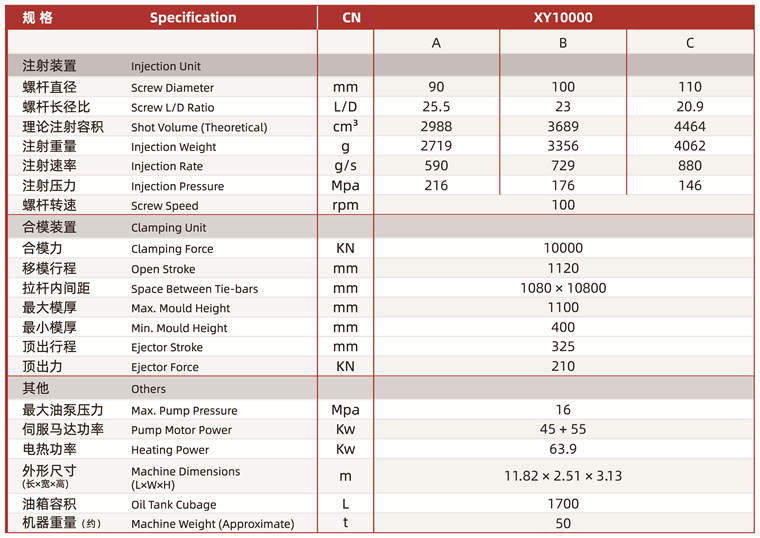 Double guide pillar support, double cylinder balanced injection, stepless high-torque hydraulic motor directly drives the screw melting device, force-sealed seating device, high-quality nitrided alloy steel screw and barrel, surface bimetal treatment to extend life, available for A , B, and C diameter screws, combined with a variety of special injection devices, ensure the injection molding of various materials.