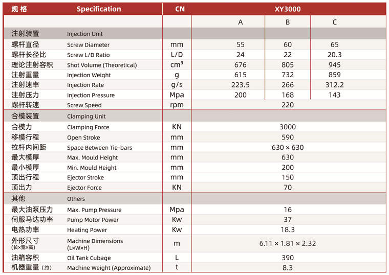 Double guide pillar support, double cylinder balanced injection, stepless high-torque hydraulic motor directly drives the screw melting device, force-sealed seating device, high-quality nitrided alloy steel screw and barrel, surface bimetal treatment to extend life, available for A , B, and C diameter screws, combined with a variety of special injection devices, ensure the injection molding of various materials.