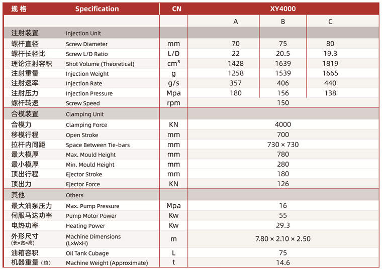 Double guide pillar support, double cylinder balanced injection, stepless high-torque hydraulic motor directly drives the screw melting device, force-sealed seating device, high-quality nitrided alloy steel screw and barrel, surface bimetal treatment to extend life, available for A , B, and C diameter screws, combined with a variety of special injection devices, ensure the injection molding of various materials.